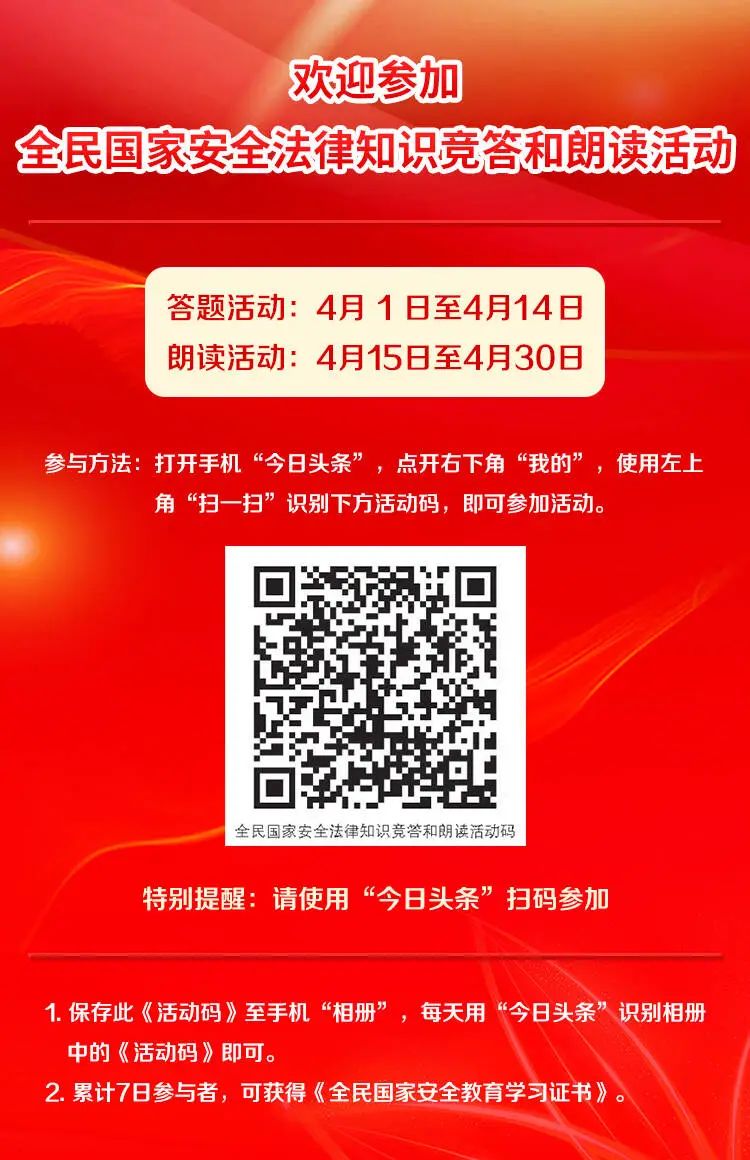 今年是國(guó)家安全法頒布施行10周年,4月15日是第十個(gè)全民國(guó)家安全教育日。為深入貫徹落實(shí)習(xí)近平總書記關(guān)于全面加強(qiáng)國(guó)家安全教育的重要指示批示精神,推進(jìn)國(guó)家安全法治宣傳教育走深走實(shí),增強(qiáng)全民國(guó)家安全意識(shí)和法治意識(shí),倡議大家參加全民國(guó)家安全法律知識(shí)競(jìng)答和朗讀活動(dòng)。