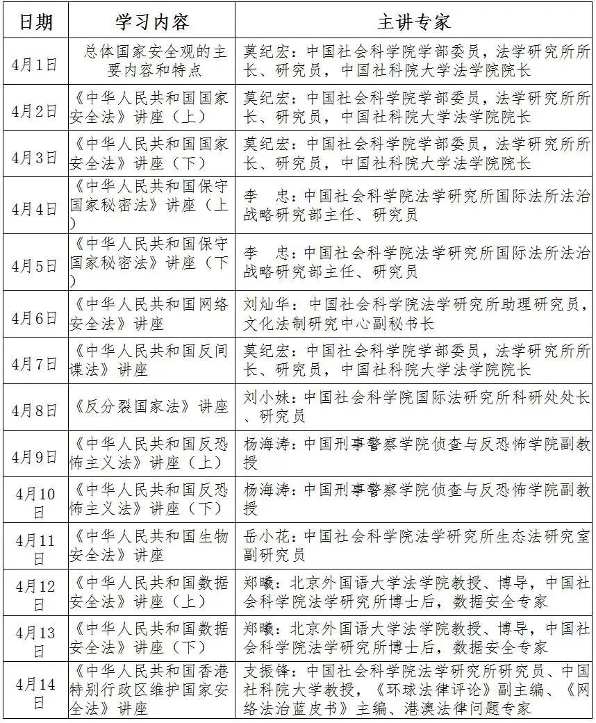 學(xué)習(xí)總體國(guó)家安全觀的主要內(nèi)容和特點(diǎn)、國(guó)家安全法、國(guó)防法、反分裂國(guó)家法、反間諜法、保守國(guó)家秘密法、反恐怖主義法等。朗讀法律全文。專家講座配備有競(jìng)答試題。